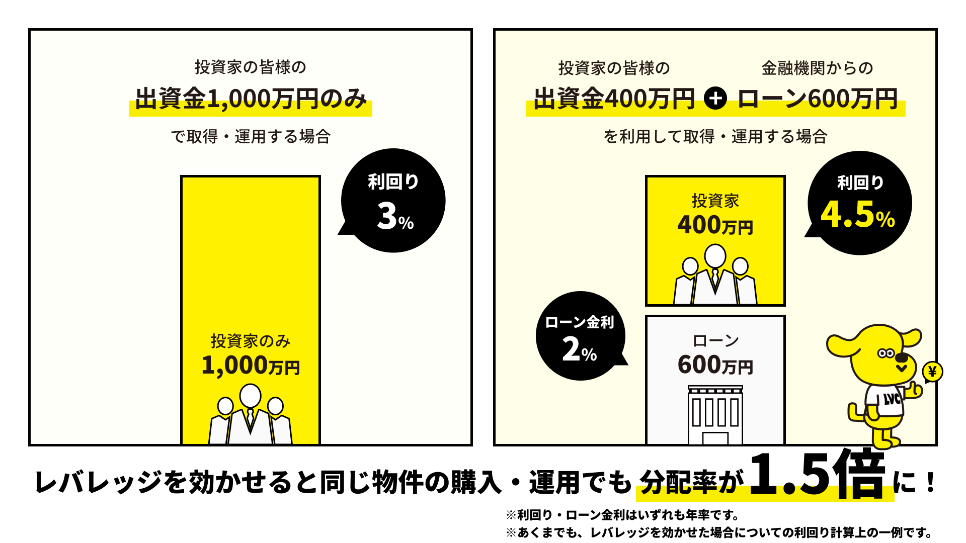 LEVECHYでは、SPCのスキームを活用することでローンの活用が可能です。投資家の資金とローンを併用することで、少ない資金でもより大きな物件の購入を可能にします(レバレッジ効果)。